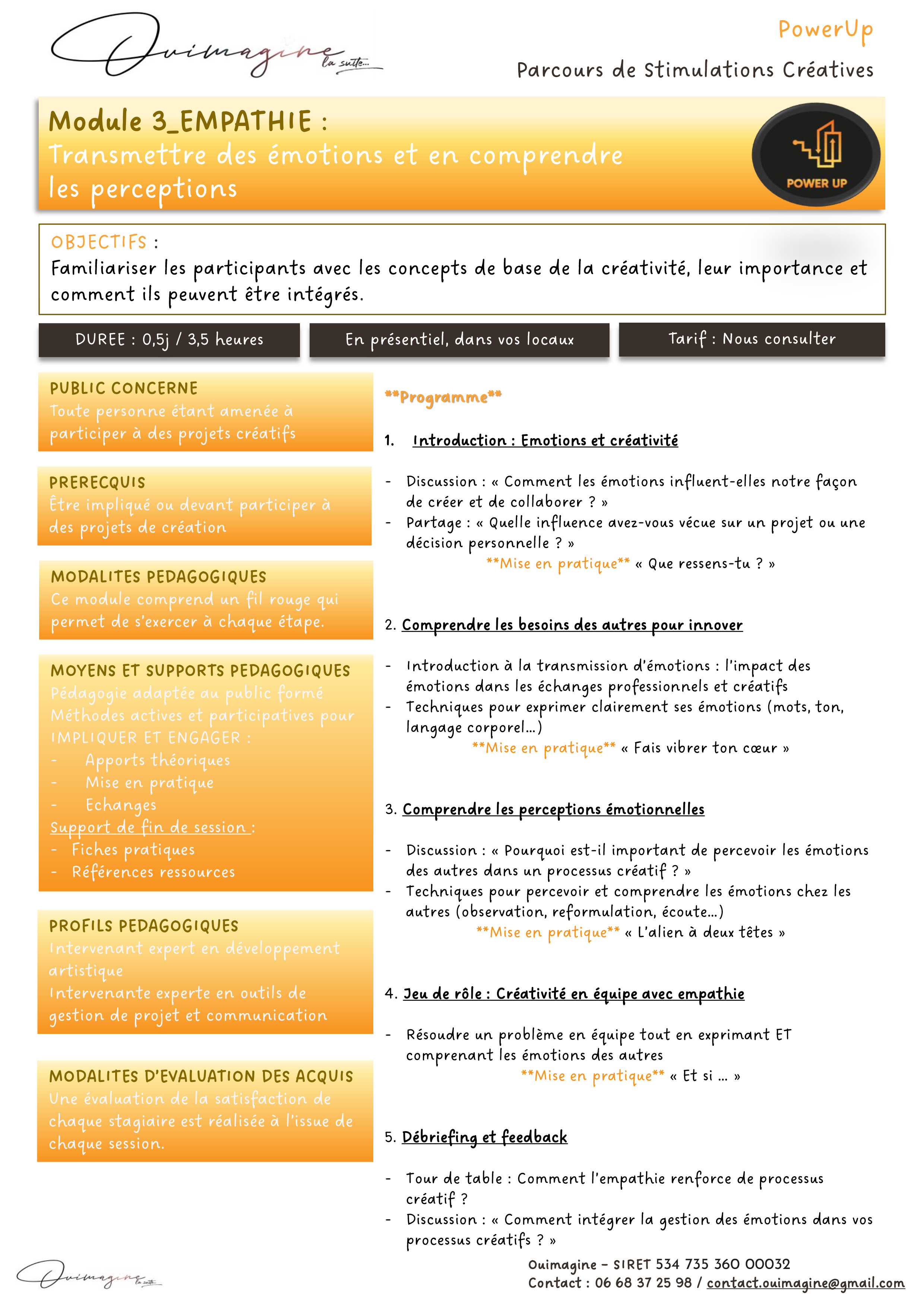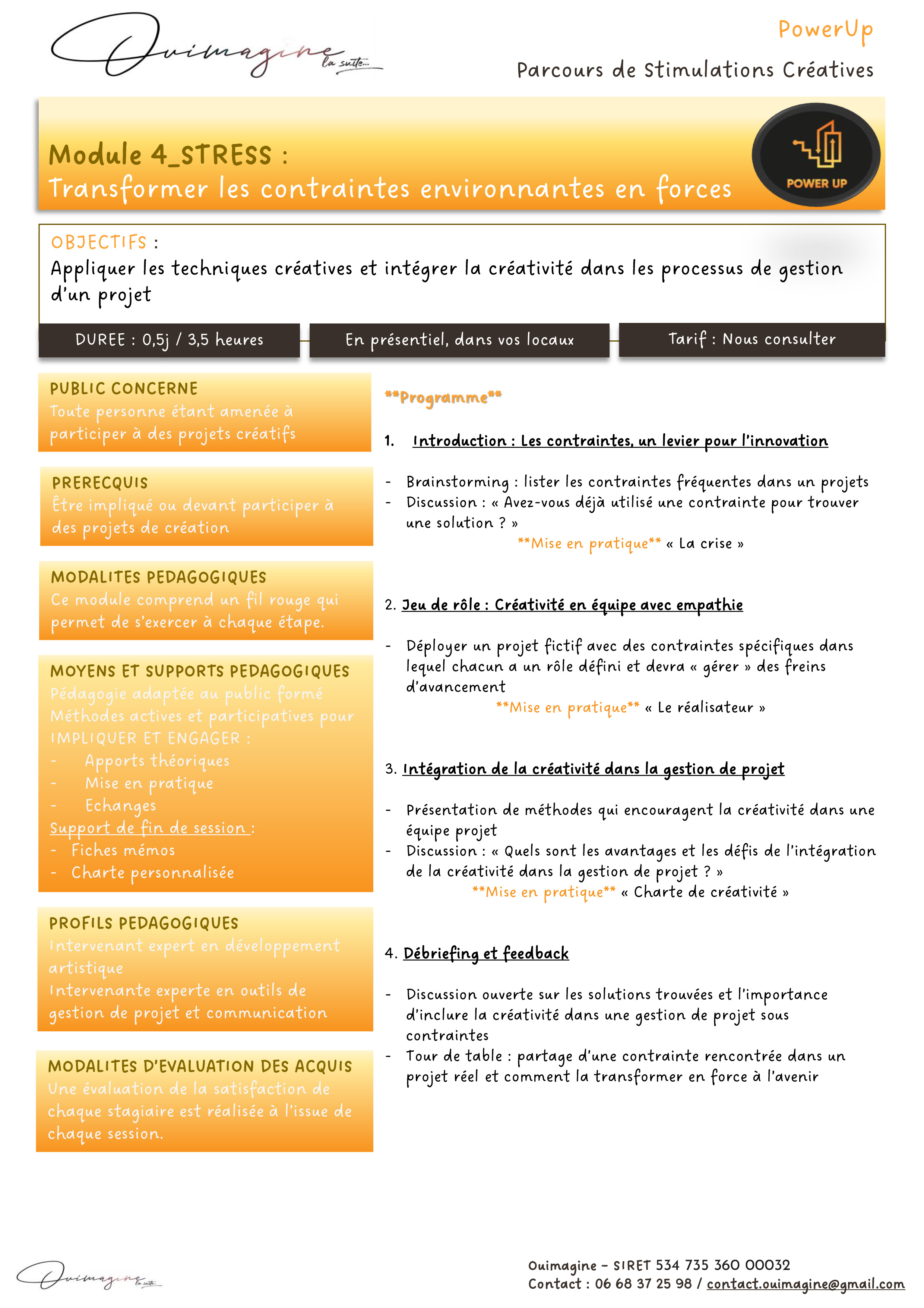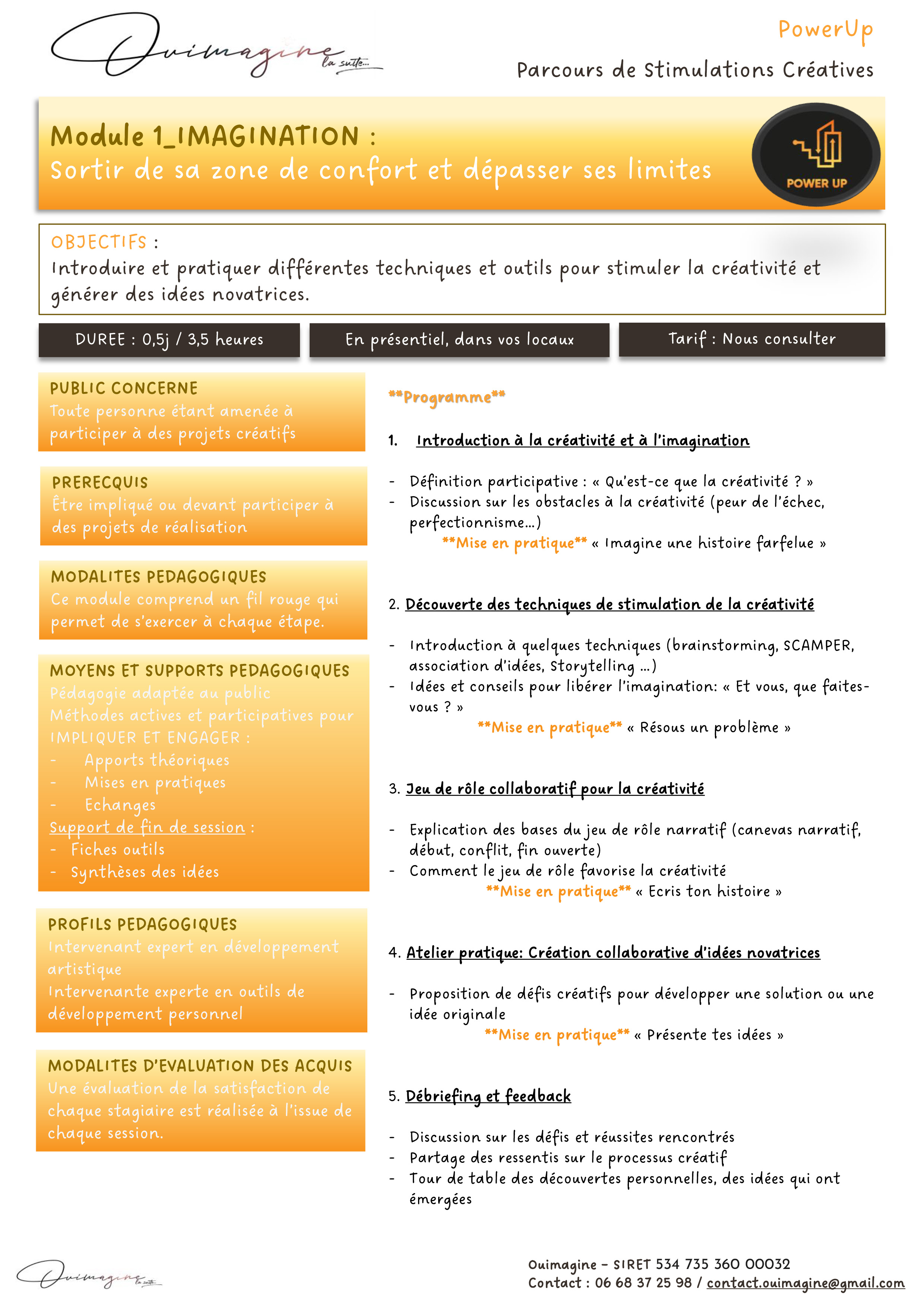 Développer la créativité des participants en les guidant à travers 4 modules progressifs, chacun axé sur un aspect spécifique de la pensée créative :
